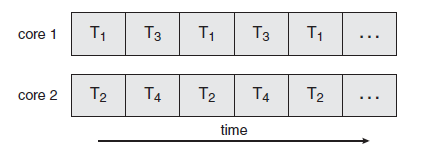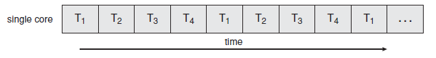 - Single computing core 상에서, concurrency는 단순히 Thread의 실행이 시간에 따라 교대로 실행된다는 것을 의미한다.