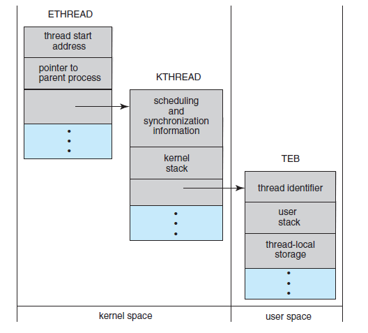 Thread의 스케줄링 및 동기화 정보, kernel mode에서 실행될 때 사용되는 kernel stack 등을 가짐.