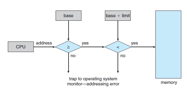 - base와 limit register를 사용하여 Memory 보호 기법을 제공할 수 있다.