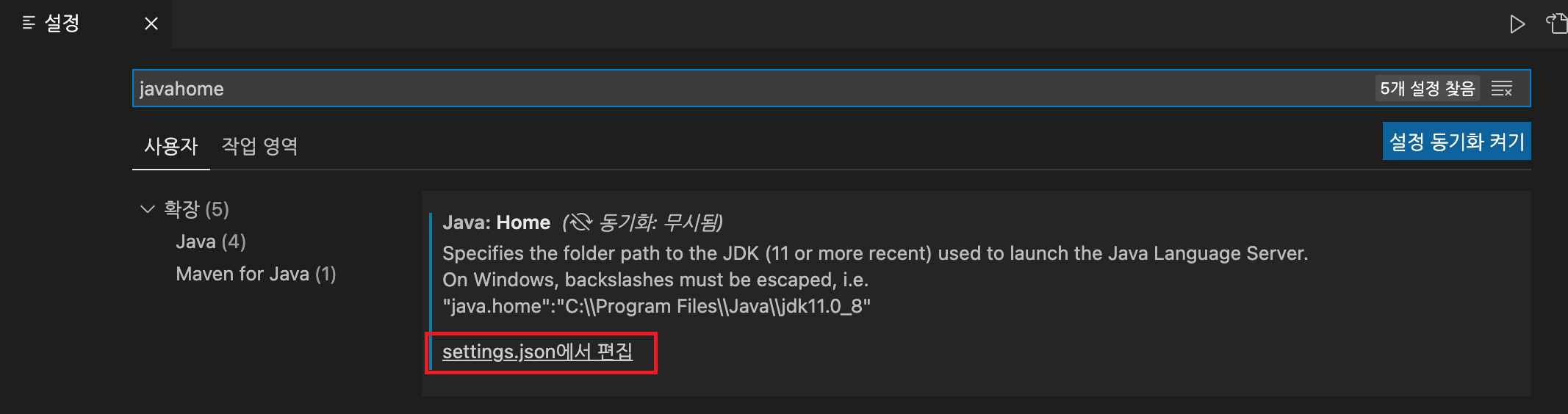 3-(2) '설정'의 검색창에 'javahome'을 검색한 뒤, 'setting.json에서 편집(Edit in setting.json)'을 클릭