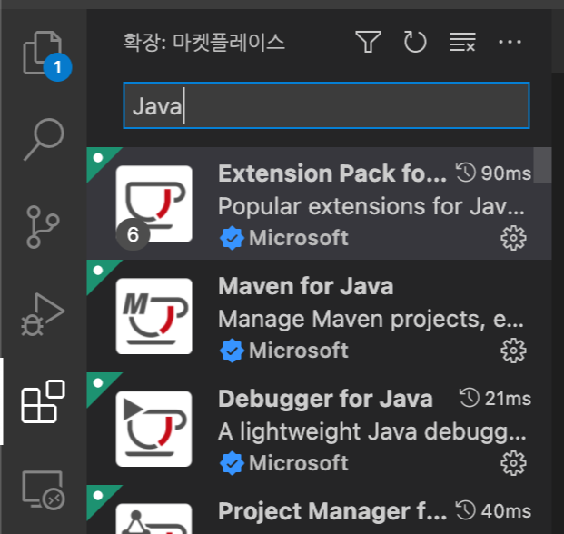 1-(1) 확장(Extension) 아이콘을 누른 뒤, 검색창에 'Java'를 검색하여 Extension Pack for Java'를 클릭